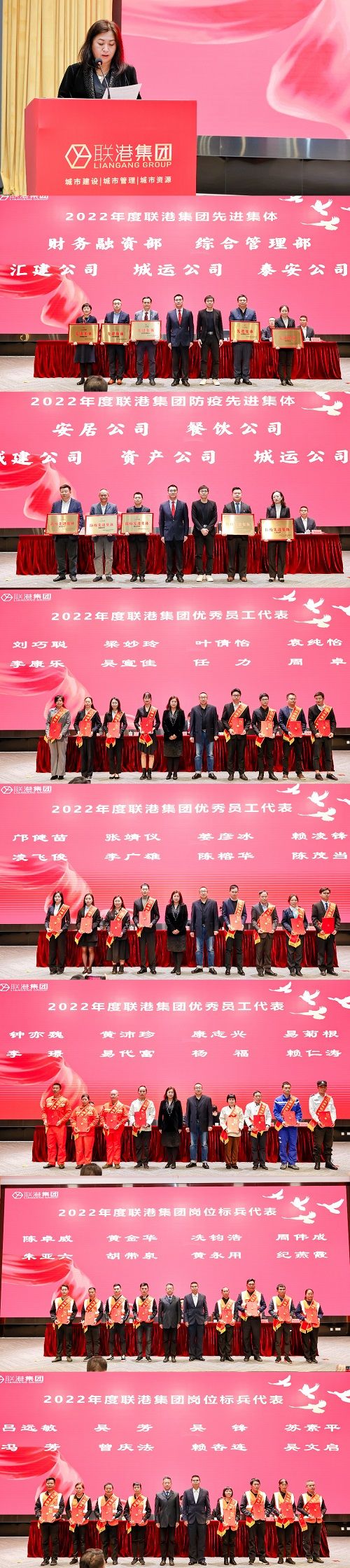 隨后,集團(tuán)監(jiān)事會(huì)主席邱影同志宣讀了聯(lián)港集團(tuán)2022年度先進(jìn)集體、防疫先進(jìn)集體、優(yōu)秀員工及崗位標(biāo)兵的表彰決定,區(qū)財(cái)政局邱局及集團(tuán)領(lǐng)導(dǎo)班子為獲獎(jiǎng)單位及優(yōu)秀代表頒發(fā)了牌匾及證書,先進(jìn)集體、防疫先進(jìn)集體和崗位標(biāo)兵代表分別上臺(tái)作了發(fā)言。