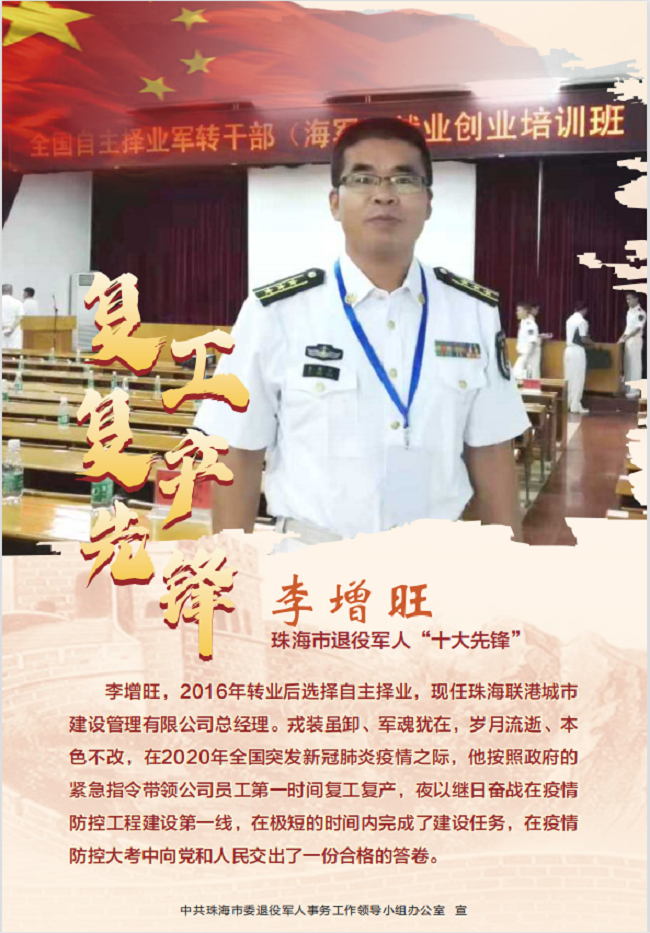 2022年4月26日,接珠海市委退役軍人事務工作領(lǐng)導小組辦公室通知,珠海聯(lián)港城市建設(shè)管理有限公司總經(jīng)理李增旺獲評“珠海市退役軍人十大先鋒—復工復產(chǎn)先鋒”。