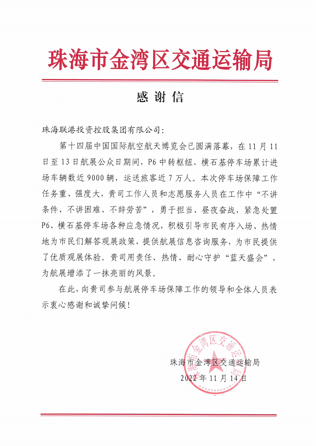 珠海市金灣區(qū)交通運輸局向聯(lián)港集團參與航展停車場保障工作的領(lǐng)導和全體人員表示衷心感謝和誠摯問候!