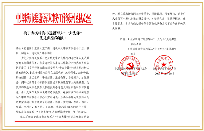 2022年4月26日,接珠海市委退役軍人事務(wù)工作領(lǐng)導(dǎo)小組辦公室通知,珠海聯(lián)港城市建設(shè)管理有限公司總經(jīng)...